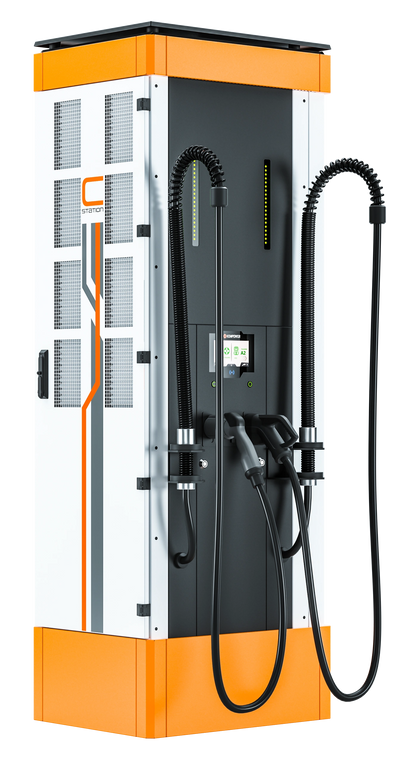 Kempower C-Station is a compact and modular fast electric vehicle charging station for electric cars, electric commercial vehicles, and electric off-highway vehicles. C-Station is a combined CPU and a Satellite as a single unit. It inherits the user interface hardware and cable handling from the Satellite post.